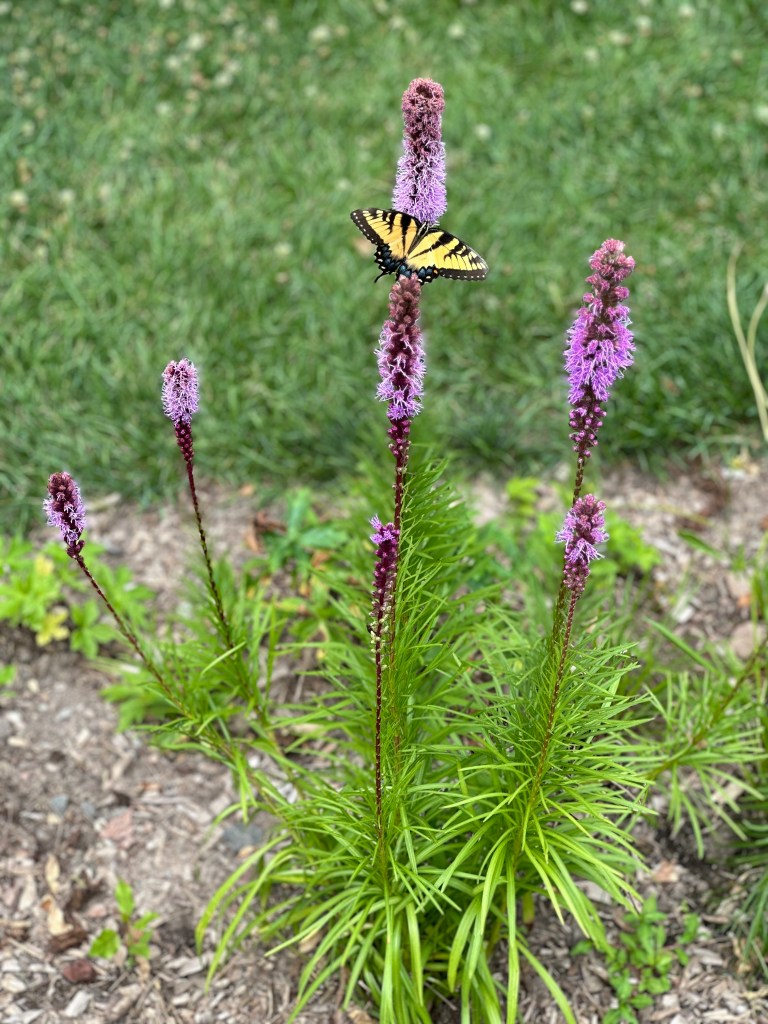 A homeowner’s garden in Clifton, NJ. After adding Dense blazing star to her landscape the Eastern tiger swallowtails started to appear.